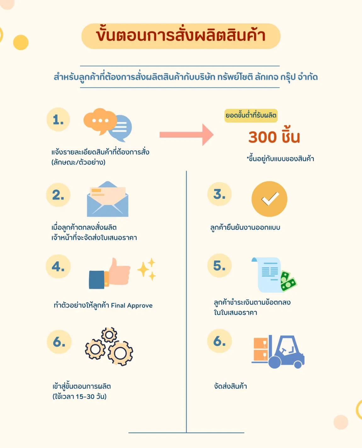 2. จำนวนที่สั่งผลิตขั้นต่ำ 300 ชิ้น (ขึ้นอยู่กับเเบบของสินค้า) ลงออเดอร์วันนี้ ปรึกษาฟรี พร้อมออกแบบ ขึ้นตัวอย่างฟรี แพ็คจัดส่งถึงที่